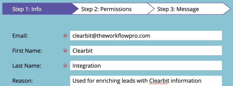 - Populate the “Reason” field if desired e.g. “Used for enriching leads with Clearbit information”
