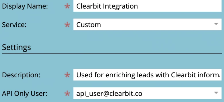 - Select the Clearbit API user that we created in the previous section in the “API Only User” dropdown