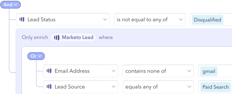 The selective enrichment section is where you define which leads from your Marketo instance can be enriched by Clearbit. This is important because you do not want to waste credits enriching leads unnecessarily e.g. if they have been disqualified by your sales team, they have a freemail address etc. As shown in the image below you can use conditional “AND” and “OR” logic with your Marketo fields to define your enrichment criteria.