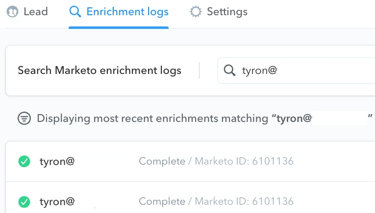 Once your Clearbit enrichment is up and running you can use the “Enchiment logs” tab to search for any leads from your Marketo instance to see what information Clearbit found about them.