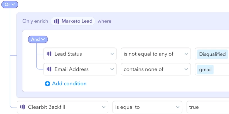 - Add an “OR Clearbit Backfill = true” condition to whatever logic is already in your selective enrichment criteria