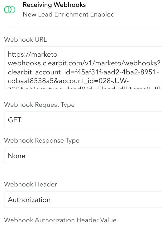 Marketo webhook settings in Clearbit
