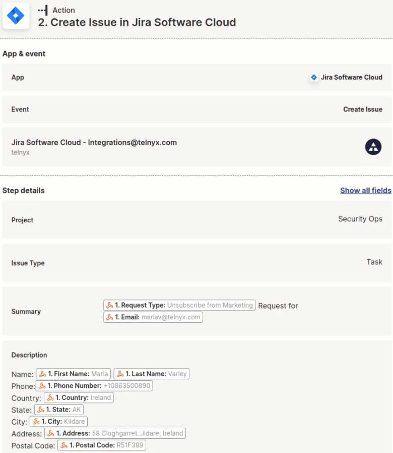 The next step takes the information that will be sent by the webhook to Zapier and uses it to populate a Jira ticket that is then moved into the “To Do” column of the responsible party in Step 3.