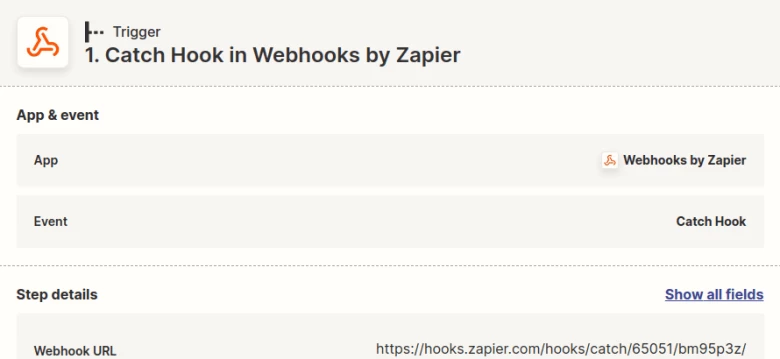 - Paste the “Webhook URL” from the “Catch Webhook” trigger in Zapier into the “URL” field