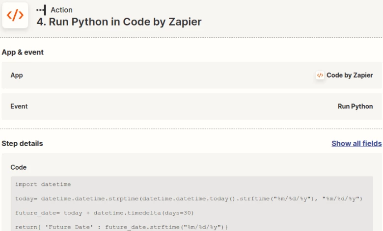Step 4 in this Zap is completely optional. All this step does is use some Python code to determine the date 30 days from the form submission date when the Jira ticket created in Step 2 will need to be completed.