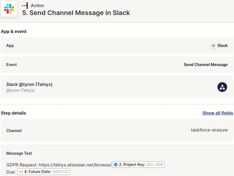 The final step in this Zap then uses the project key of the Jira ticket in Step 2 to create a link to this Jira ticket which will be sent to an appropriate Slack channel along with the due date for this ticket.