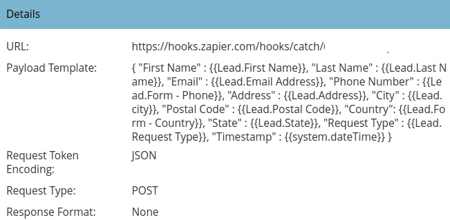 For this particular example where information from a form fill is being sent to Zapier, the webhook template looked like this: