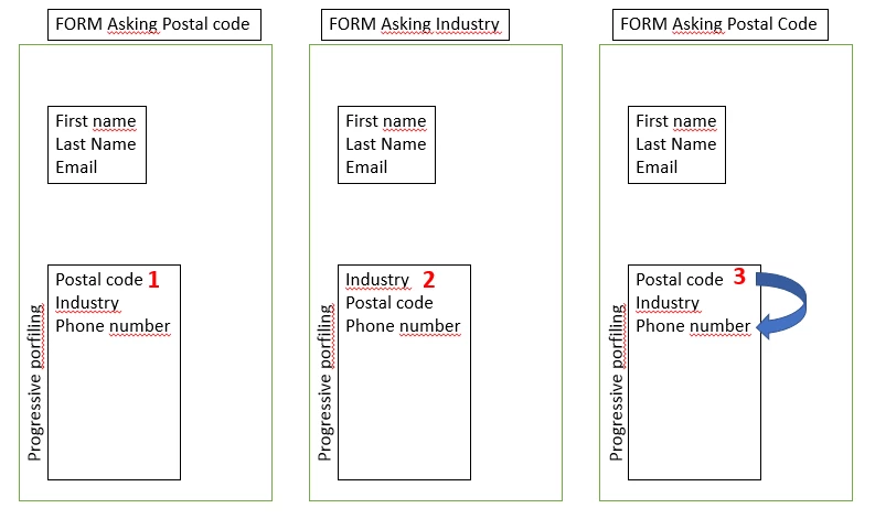 Action 3 : 2 days after, the same prospect fills the right form. Marketo detects that he has already postal code and industry, so he asks phone number.