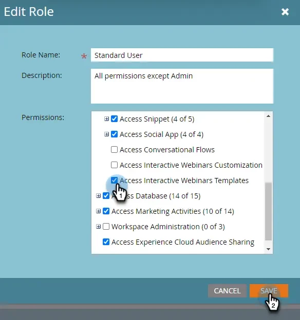 For using Interactive Webinars’ templates, a Marketo Admin must create a role or use an existing role and provide the “Access Interactive Webinars Templates” permission to this role in the “Access Design Studio” section. All users then who are added to this role, would have an ability to create an Interactive Webinars Template. It is recommended to create a separate role so that the usage is restricted only to limited set of users and the creation of the templates get moderated.
