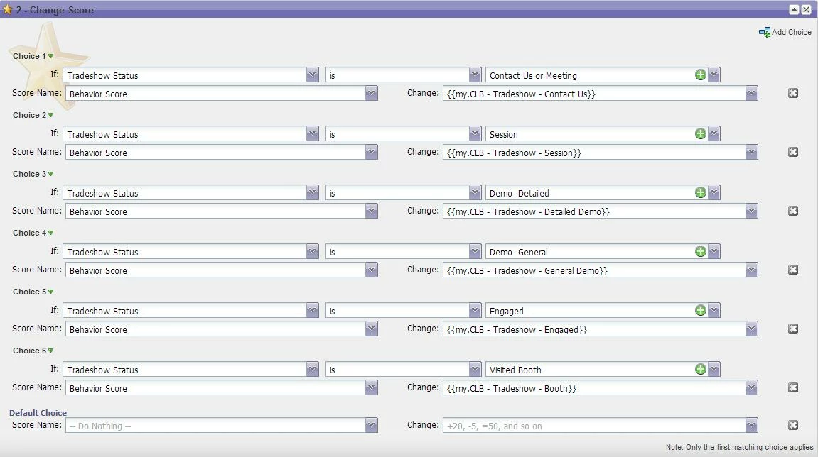We use a Tradeshow form that has a field called Tradeshow Status that includs a picklist with such choices as Visited booth, engaged, demo, session, etc. We than use the Fills out form = Tradeshow form and the Tradeshow status field to create scoring for the tradeshow. We have the sales reps fill out the form for each person they talk to that comes to the booth or cards collected. See below. We would use the same filters to score to do the interesting moment.