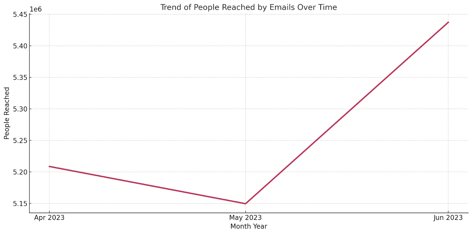 How does email reach correlate with other metrics like open rate, click-through rate, and conversion rate? An increase in reach is good, but we need to ensure that people are also engaging with your emails and converting. A handy graph that shows changes in measures such as the percentage of emails opened and clicked gives us a deeper understanding.