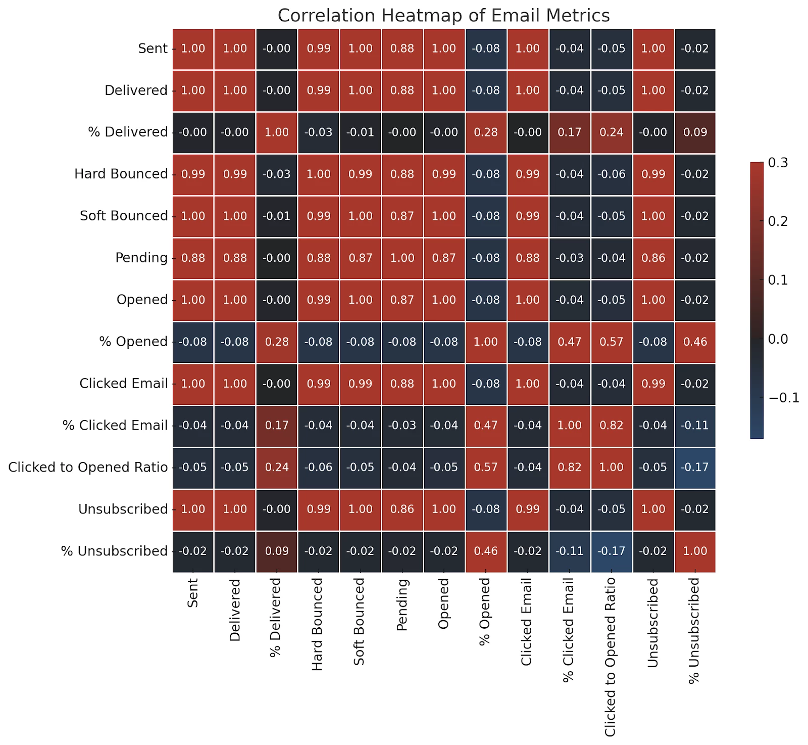 Another useful visual to have is a heatmap of Correlation between metrics. This will tell you how your metrics change, compared to another metric. Find the positive and negative correlations, and identify what you can maximize on. A positive correlation means that when one variable goes up, the other tends to go up as well. If correlation between % Delivered and Sent is negative, it means that an increase in Sent Emails may hamper Deliverability.