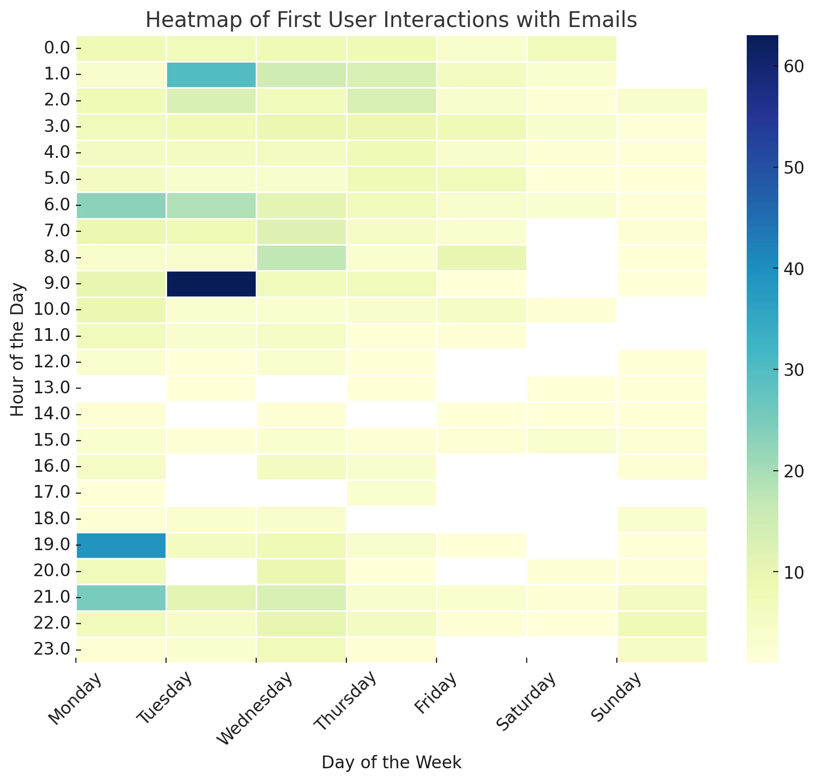 Another great heatmap you can create is an activity heatmap. These heatmaps provide insights into the times when users are most likely to first interact with emails. You can use this information to optimize the timing of your email campaigns, aiming to send emails when users are most likely to interact with them.