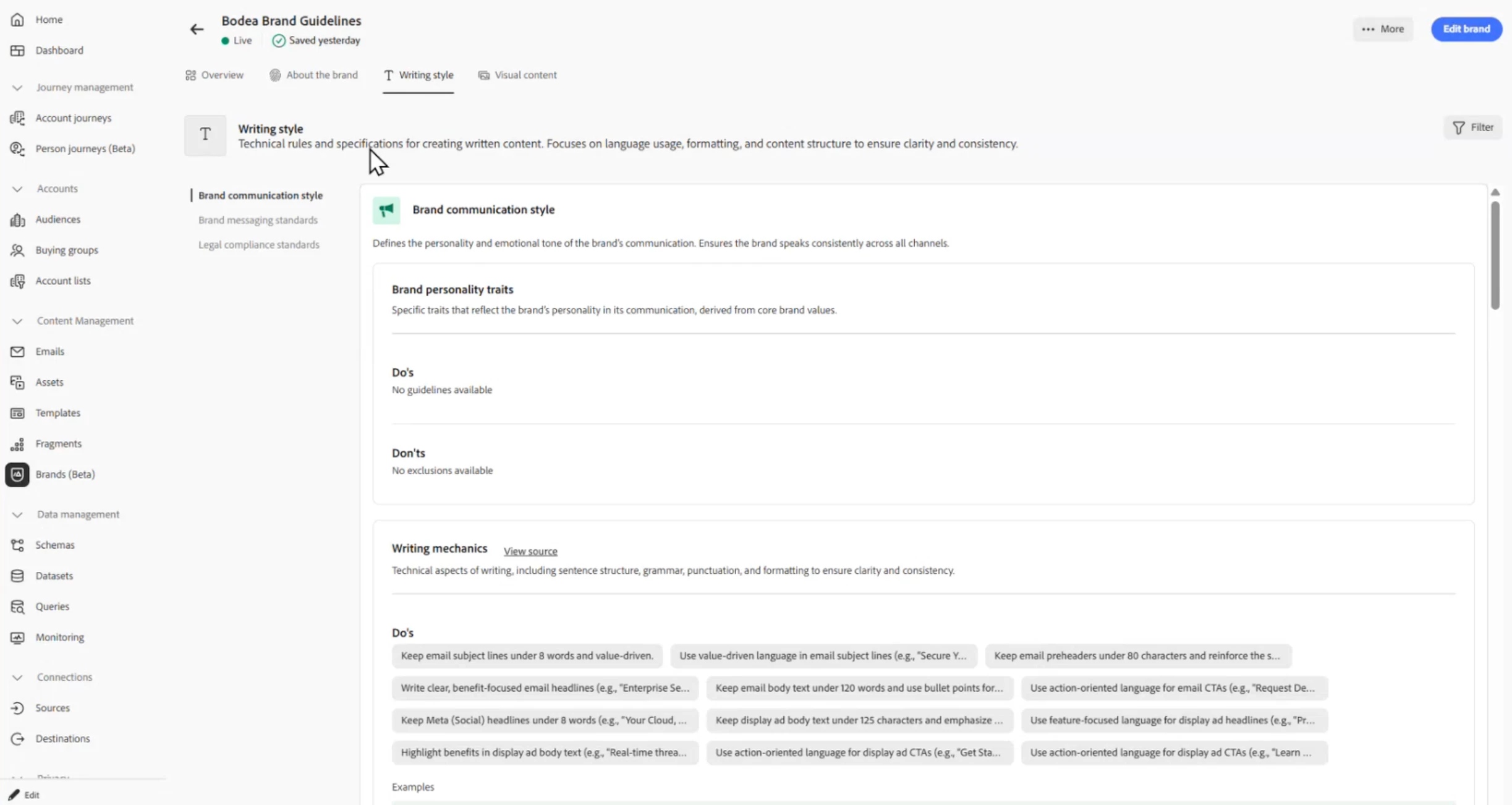 Brands lets you upload your brand guideline documentation directly into Marketo Engage or Journey Optimizer B2B Edition, where the functionality automatically extracts and structures: