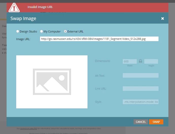 Wondering if something recently changed in Marketo. I upload and image file and when I select it in the email to add ALT Text or a Link, it comes up with and "Invalid Image URL"