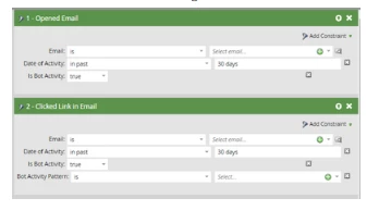 We have Bot Activity filter enabled under Email section in Admin. I can see a good number of activities recorded there both for IAB list and Proximity Pattern. They both are in a few thousands. However, when I try to create a smart list with 'Clicked link in email', I cannot see the filter 'Is Bot activity = True/False' filter. I also don't see them on email performance reports in Analytics. Thank you.