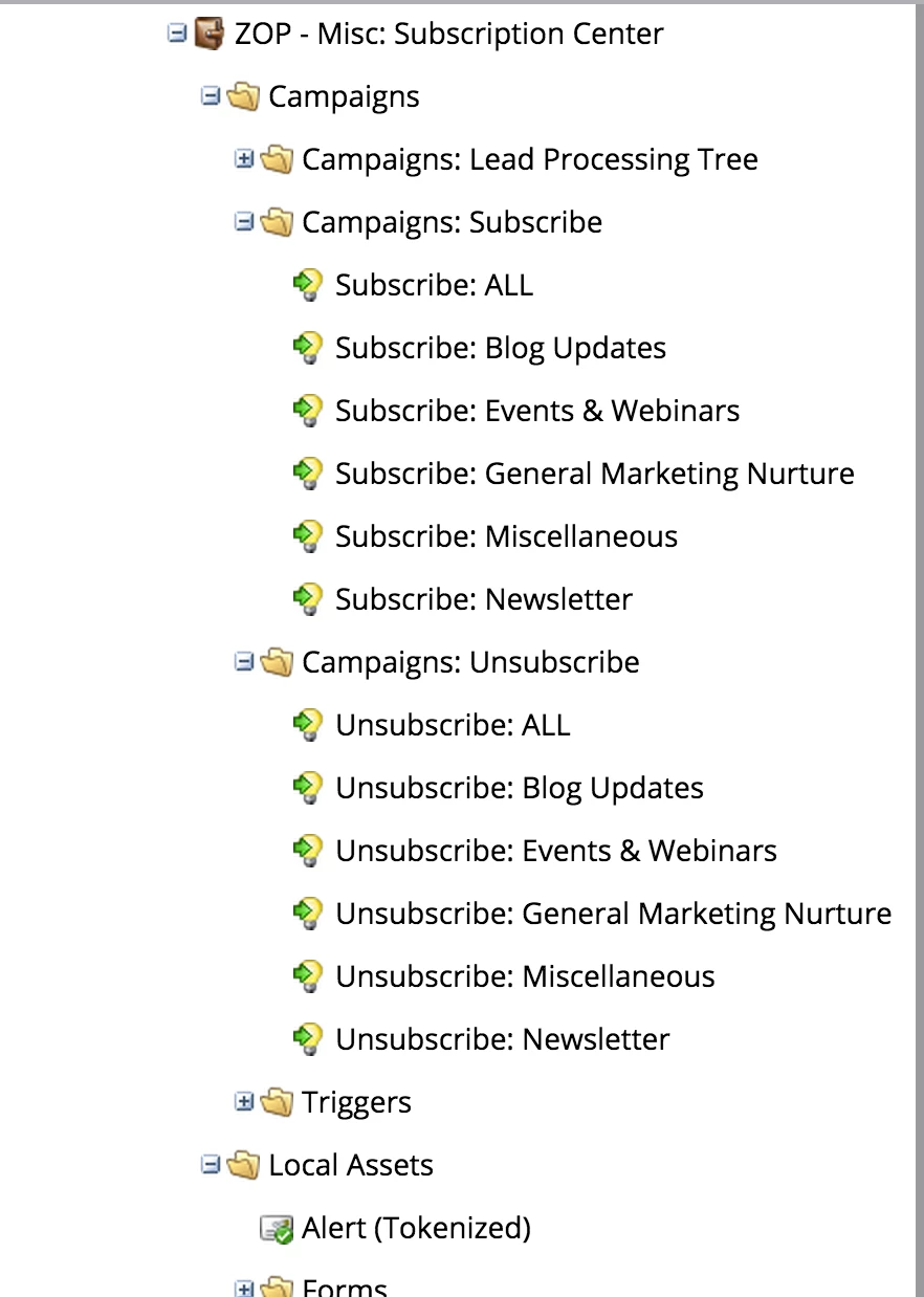 Then your Subscription Center should have topical unsubscribes triggered based on a person's visiting those specific topical unsubscribe pages.