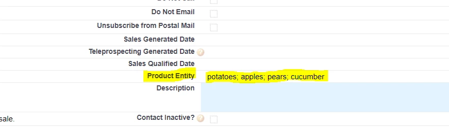 Let's say, I sell vegetables and fruit, in a Product Entity field in SFDC my targeted record has this field populated with: potatoes, apples, pears and cucumber: