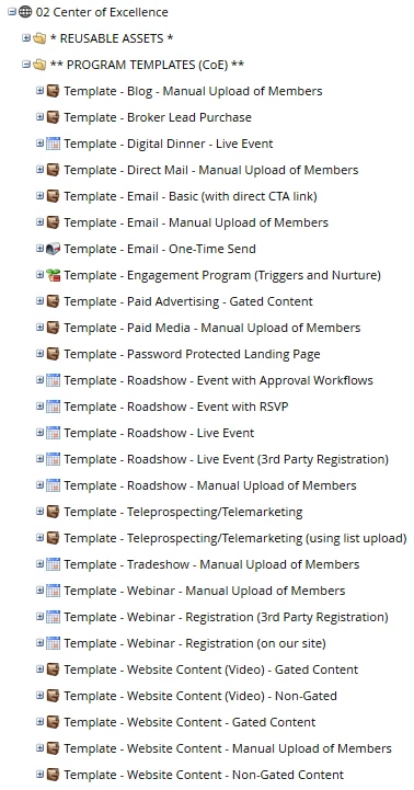 We have a comprehensive library of program templates that are used as the basis for any new program across our 23 country workspaces. Each program has been carefully created and tested to ensure the program will be able to be successfully cloned to other workspaces (no references to assets (emails, landing pages, forms) in design studio; no references to workspace-specific smart lists; etc.). This allows us to have a very scalable Marketo environment without having to re-create every program from scratch each time.