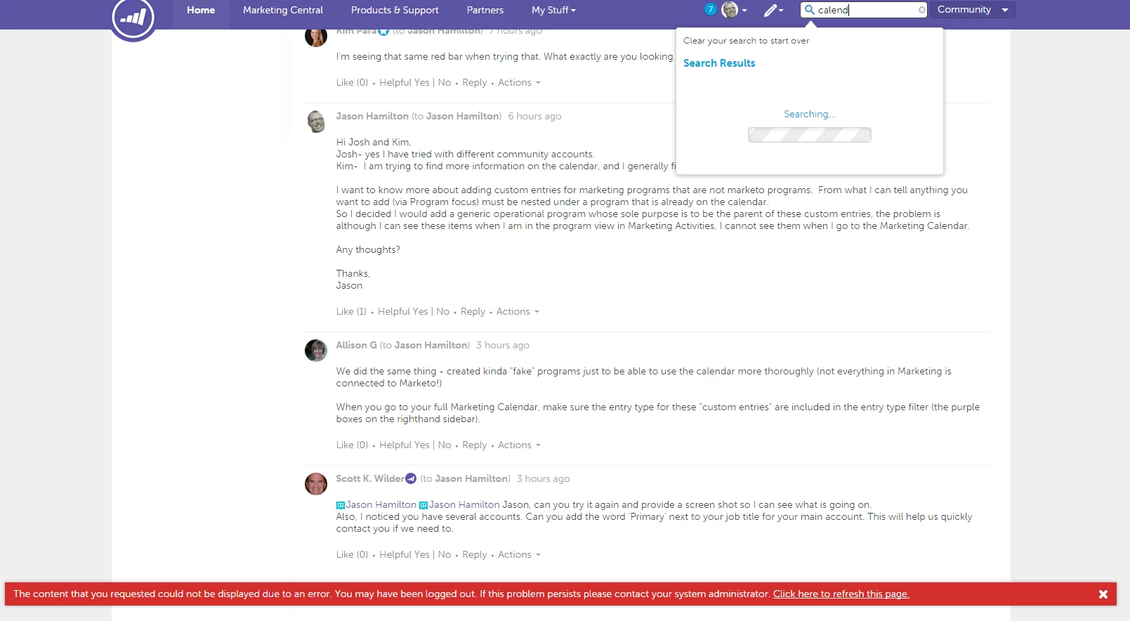 Every time I try and type calendar in the search box, i get a red bar across the bottom of my screen that says 'The content you requested is not available due to an error..." I have tried it in different instances of Marketo, with different accounts, and the same thing happens.