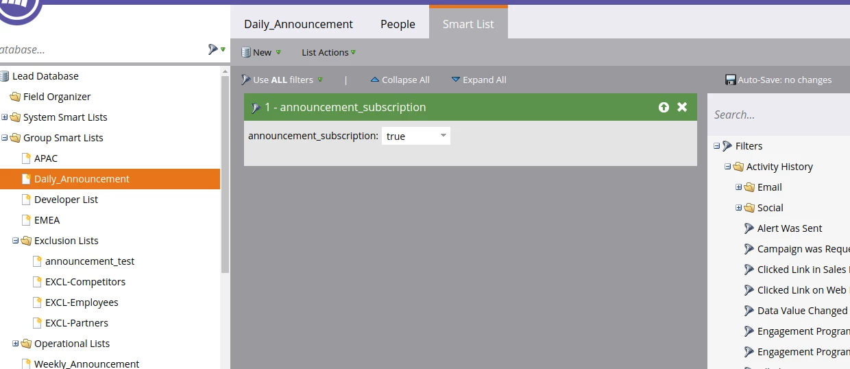 Eg: I have Daily_announcement and Weekly_announcement smart list and user is subscribing into it using form fields Daily and Weekly. Now if user Subscribed for Both Daily and Weekly then we can see entry in both smart list but next time if user checked only Weekly from form and subscribe then entry for Daily is removing from Daily_announcement smart list for same user and only remain in Weekly_announcement.