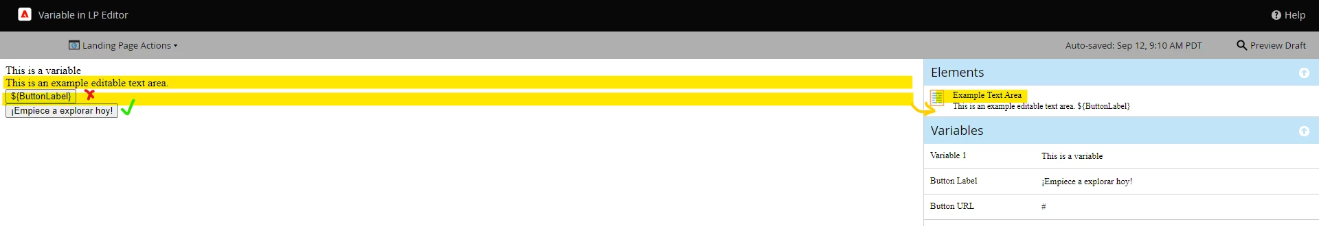 I did some add'l testing this morning and setup a Guided LP template with some variables to match your situation. What I discovered is that when the variables are contained inside an editable text area that they don't work, but when they are not inside an editable area, they do work.
