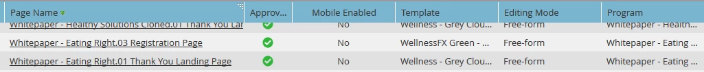 Some of the things the report doesn't include are Page URL, Template, Editing Mode and Program. This information can be found in the Design Studio area of Marketo. When you click on Landing Pages you will only see the Page Name, Approved, Mobile Enabled, Templates, Editing Mode and Program. However, when you export the information you will also be able to see the Page URL, Views and Conversions.