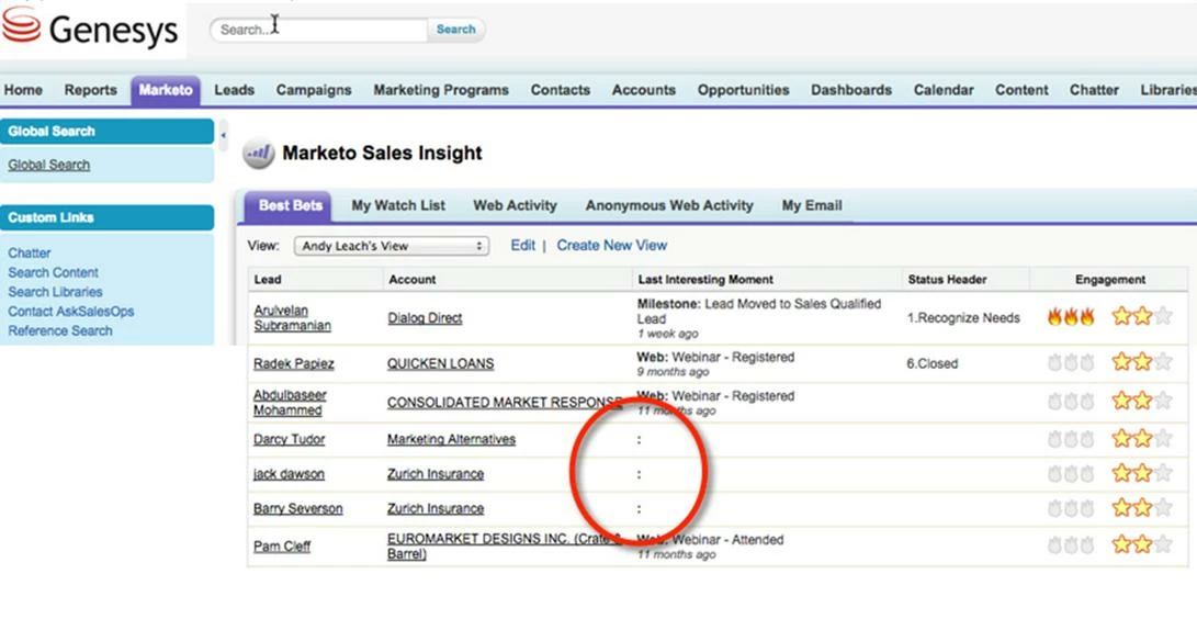 We are seeing an issue where the "last interesting moment" column in Marketo Sales Insight (SFDC) is showing a ":" when there is no data to populate the field (see image below).