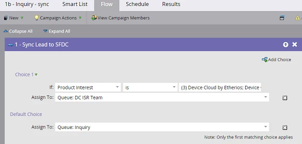 (Choice 1 above was set up to route leads for a specific business unit; all other Leads go to Inquiry.)