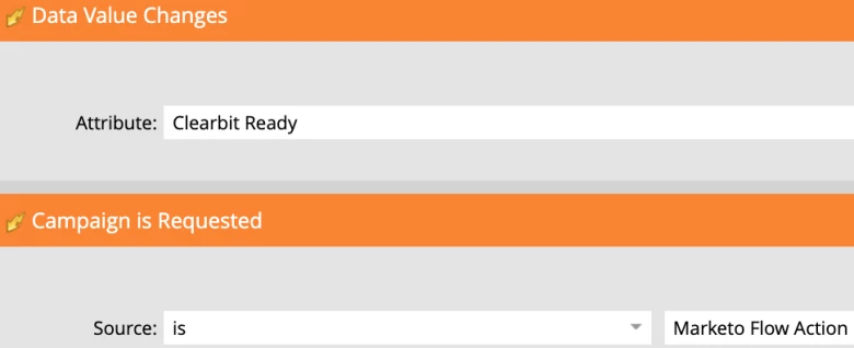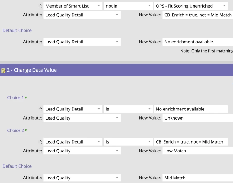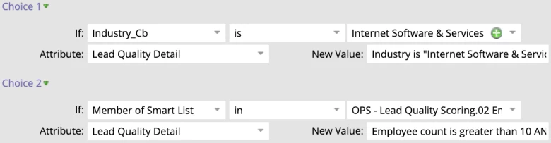 As well as simple field “is equal to” and field “contains” matching, these choices can also use the “Member of Smart List” option to evaluate more complex matching logic e.g. Clearbit Industry is “Internet Software and Services” AND Clearbit Employees is greater than 10.
