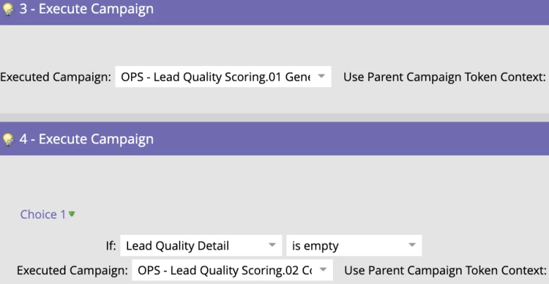 Choice logic is used in these “Execute Campaign” flow steps so that once a person’s Lead Quality fields have been set that they will not enter any of the remaining “Execute Campaign” steps in the flow.