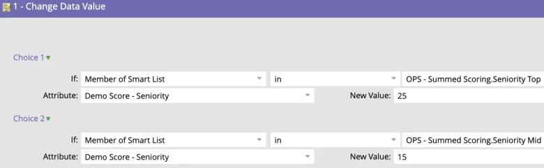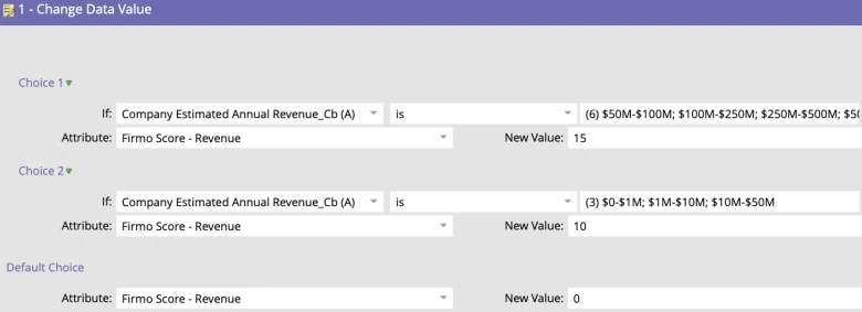 Each of the executable campaigns responsible for calculating a demographic or firmographic score uses a Change Data Value flow step with choice conditions to determine what value should go in the score field based on the values in the corresponding field.