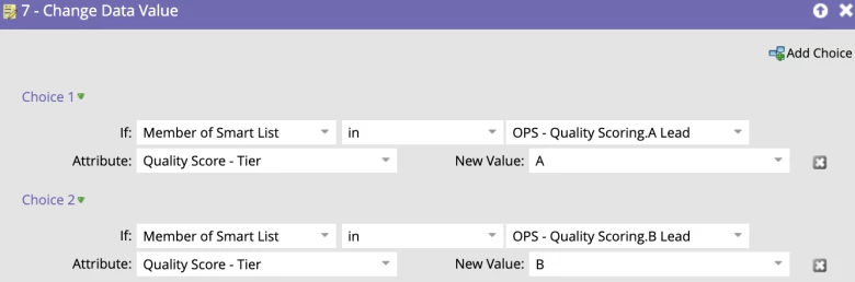 The final part of the “Quality Matrix” requestable campaign is a Change Data Value step that uses choice conditions with the “Member of Smart List” criteria to determine what Quality Score someone should get based on their demographic and firmographic score tiers.