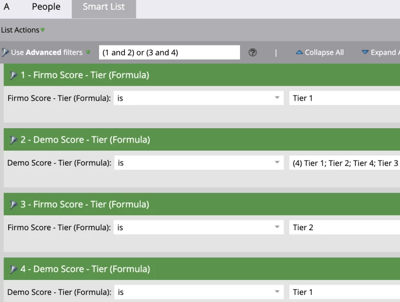 =IF({{lead.Firmo Score - Total Formula:default=0}}>=70,"Tier 1",IF({{lead.Firmo Score - Total Formula:default=0}}>=30,"Tier 2" ,IF({{lead.Firmo Score - Total Formula:default=0}}>0,"Tier 3","Tier 4")))