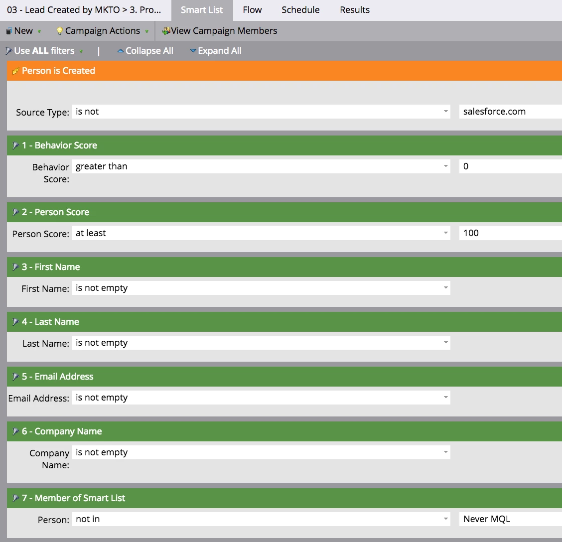 We're starting to scope out lead scoring in Marketo, and have began putting scores against different behaviours. For an MQL to be good enough quality for our Sales team, we have 6 required datapoints: first name, last name, company name, email, country and phone number.