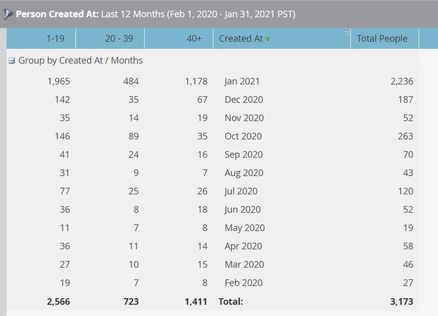 Note: I've gone with The Person Created At = All Time as I want to know, overall, which leads fell into each score group last month (if I change it to = Last Month, it will ignore leads created before that):