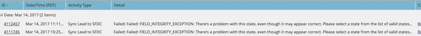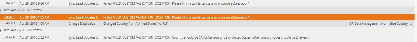 We are constantly getting these errors in Marketo and SFDC that there is a Sync Error. We have looked in Marketo to see why or what is causing the error however everything seems to be displaying correct when we drill down on each individual lead that comes through the report. We have created smart campaigns to clean up the data and look through our Normalize Data program and everything looks to be correct (two letter code). We cannot seem to find the issue, any ideas?