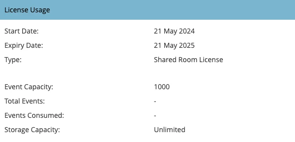 If you have the base license, you can purchase an upgrade to increase events/capacity/storage. The initial license is a “Shared Room License” which means that you cannot schedule or overlap two events simultaneously. You can purchase a license for an additional room if you need to run concurrent events. Also, you can purchase a license for additional storage if you wish to keep more records or want to leave assets in your event.