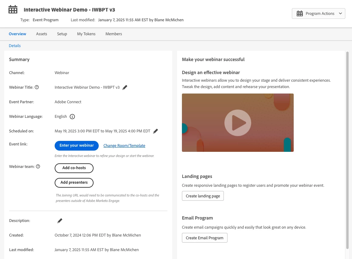 When you create an Interactive Webinar program in Marketo, the event is created and paired in Adobe Connect. This includes rescheduling or cancelling. It is all controlled in one place …the Market program dashboard. Hosts and presenters are added from the Marketo program, and their personal links are available if you need to resend them.