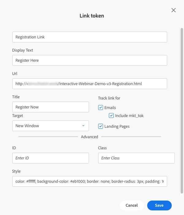 Did you look closely at the image above? There is a “link” token type … what!? I love this. In the image below you see We can drop the full URL. Isn’t that a Marketo token no-no because it won’t be recognized and tracked as a link? … Not anymore. The tracking link settings are built into the token, so now it know how to handle it in emails and landing pages.