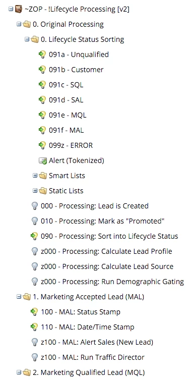 Lifecycle Processing is the backbone of how marketing automation runs, and it creates the measurement process for a data-driven marketing system. Having a fully organized Lifecycle Processing program quickly answers the question, “What happens in our marketing automation system operationally and regarding prospect communication?” It creates hooks for other operational smart campaigns, so you can very quickly try out new marketing initiatives without worrying about breaking a delicate order of operations. Importantly from an organization focused on increasing revenue from a scientific approach, Lifecycle Processing establishes measurable milestones and digests the revenue-creation process into a mathematical model that can be improved over time. Want more revenue? Increase the conversion rate from MAL to MQL. Is your SAL-to-SQL conversion rate lower than the industry standard? Increase that conversion rate for more revenue. Need to quickly pump the volume of leads for more revenue later? Feed the lead generation engine by creating a larger volume of Marketing Accepted Leads.