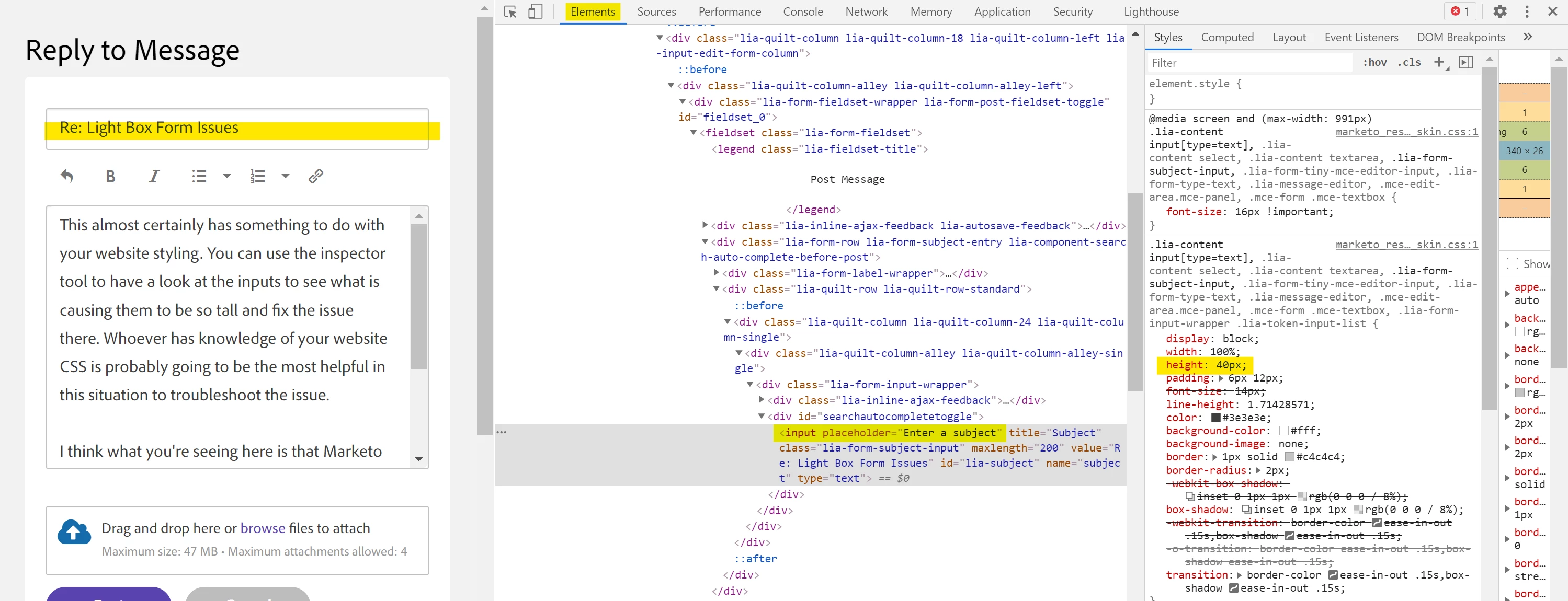 Here's a look for example at this page in the inspector pointing out the CSS for the height of the "Subject" input. There is probably something like this (maybe a "min-height") rule on your webpage that's causing the fields to be so tall.