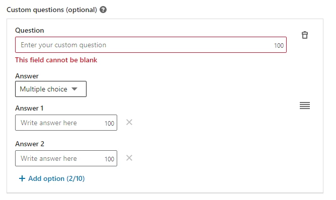 - Do not provide more than 10 choices for custom question (we need more)