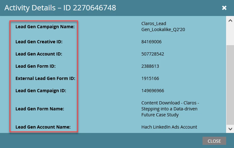 After connecting LinkedIn Lead Generation forms in LaunchPoint you will start seeing Lead Gen form fills in your Marketo instance. There is information when you double click on the "Filled out LinkedIn Lead Gen Form" activity in the activity log, that shows which Linkedin Campaign, the name of the form, etc drove the form fill. These should be available as tokens!