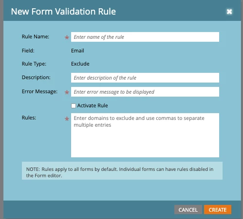- Create Global Form Validation Rules in Marketo Admin to block specific domains that have caused spam issues. Custom rules can also be created for common typos (e.g. @gmial.com) causing higher bounces or role accounts (e.g. postmaster@, noreply@, sales@ and abuse@), as these community inboxes are often checked infrequently leading to low engagement.