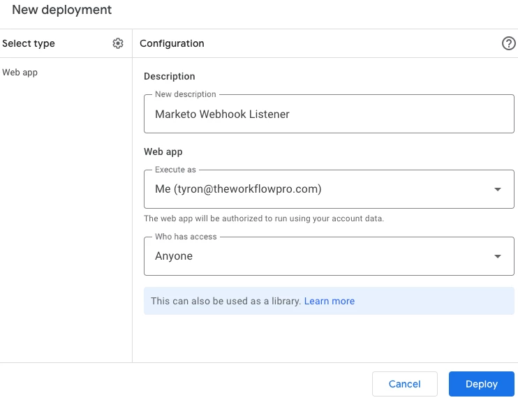 Then to deploy this Google Apps script so it is ready to catch our webhooks from Marketo we will: