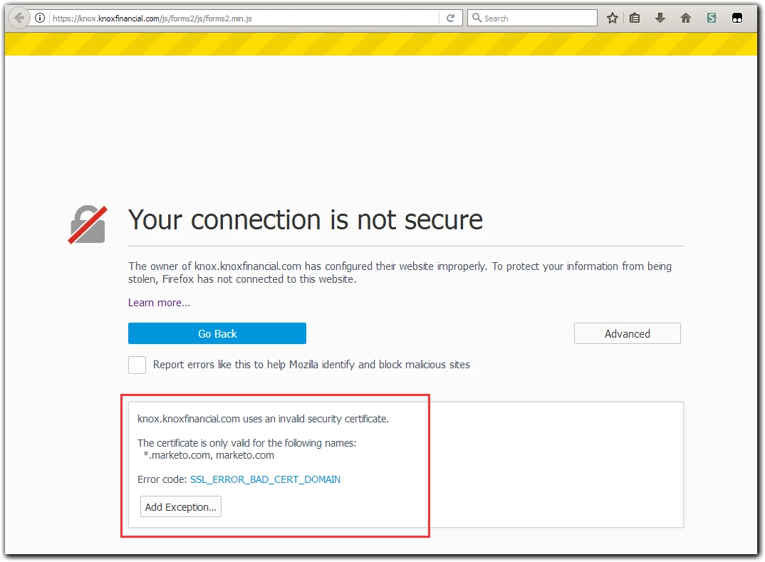 If you have a pending order with Marketo, you can quick-check the state of affairs (for the purposes of this blog post) by loading the Forms 2.0 forms2.min.js in your browser. Here's Firefox's way of saying your custom cert isn't installed yet: