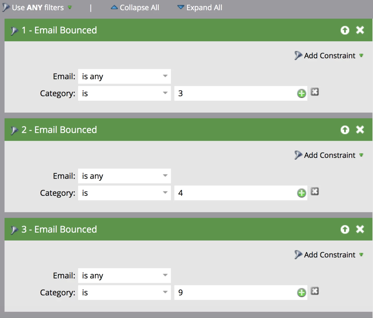 Category 1 – Should be Email Suspended (usually from spamblock). You may find leads (particularly Gmail addresses) that are Category 1 bounces, but have no data in Email Suspended or Email Suspended at. They are STILL problematic leads. You could also add a further constraint for the # of times they hit Category 1.