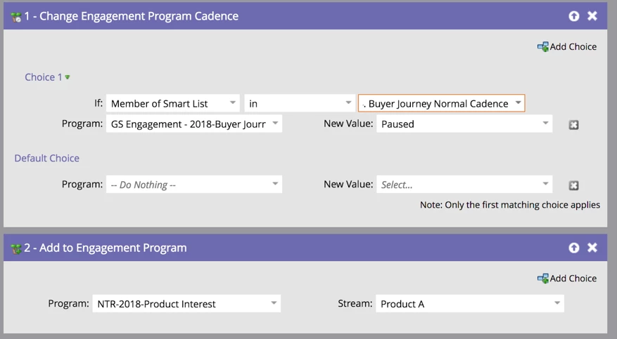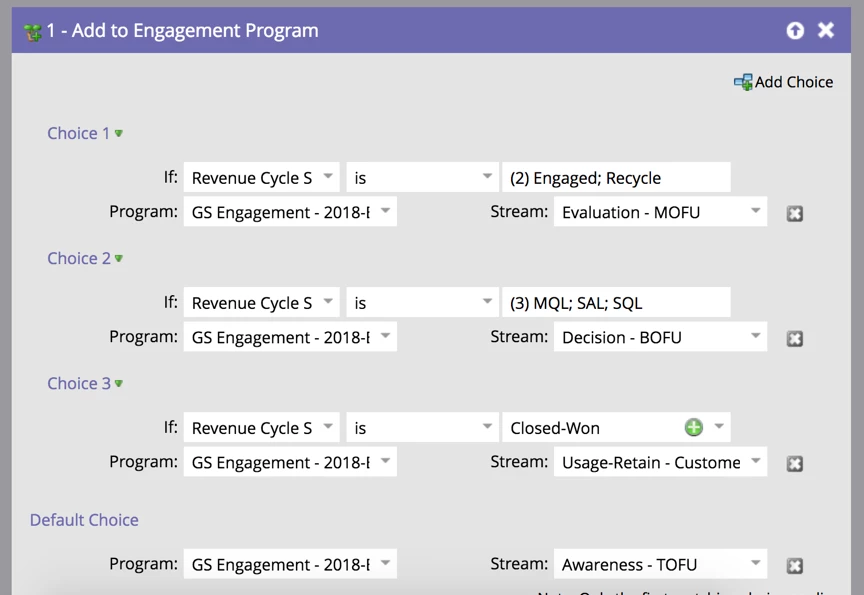 - If you have a generic nurture program, your only Flow step should be: Add to Engagement Program -> Generic Engagement Program, Stream=Stream 1. Add choices to determine which stream if you have multiple streams.