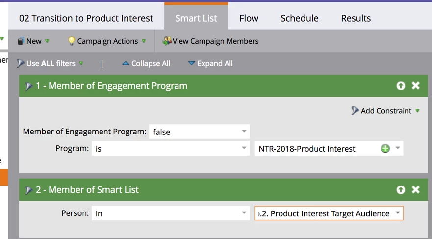 - If you have one Engagement Program that everyone goes into, skip to step 5. Otherwise, you will need to create additional target audience Smart Lists to identify which Engagement Program qualified leads should go into. For example, if you have an Engagement Program specifically for VP’s, create a Smart List “2. VP Target Audience.”